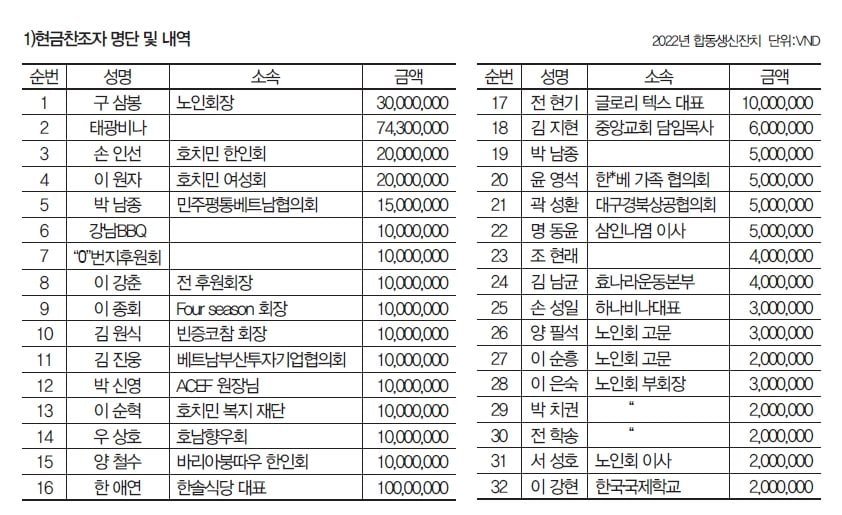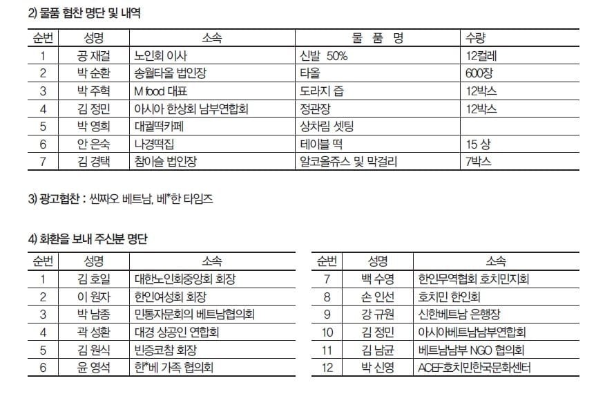 이날 생신자는 만수(萬壽: 80세 이상) 이순흥, 조병기, 양필석, 류중선, 김성창, 임정지 등 6명, 고희(古稀: 70세) 정진태, 엄명재, 이창희, 주규현, 이봉출, 박남종 등 6명이었다. 아울러 태광비나, 노인회 구삼봉 회장, 민주평통 박남종 회장, 그리고 한인회 손인선 회장을 필두로 35개 단체 및 귀빈들이 약 3억동 상당의 기부를 제공했으며, 또한 대궐떡카페를 선두로 한 많은 기업과 단체가 생신자에게는 도라지 즙 , 타올, 상차림 셋팅, 막걸리 , 신발 등의 많은 물품을 전달했다.