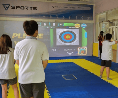 VR 스포츠실은 전용센서가 사람의 움직임을 감지하여 양궁, 테니스, 축구, 야구 등의 다양한 스포츠를 스크린을 활용하여 실습하고, 교육과정과 연계된 놀이 컨텐츠를 체험형 게임으로 즐길 수 있는 공간이다.