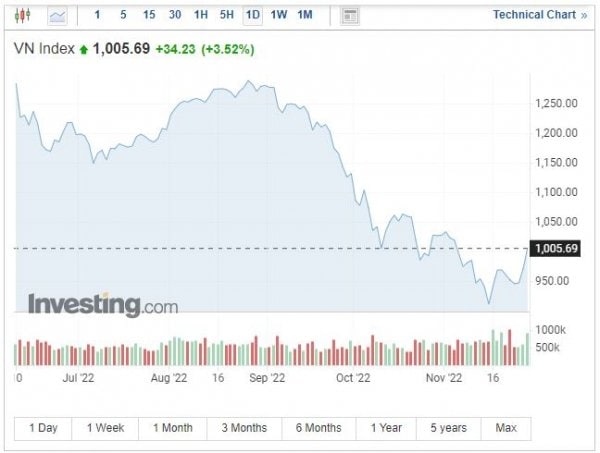 이날 VN지수는 전거래일보다 34.23포인트(3.52%) 오른 1005.69로 마감했다. 시가총액 상위30대 종목으로 구성된 VN30지수도 36.85포인트(3.81%) 상승한 1004.34를 기록했다.