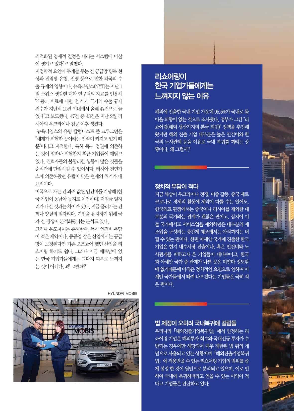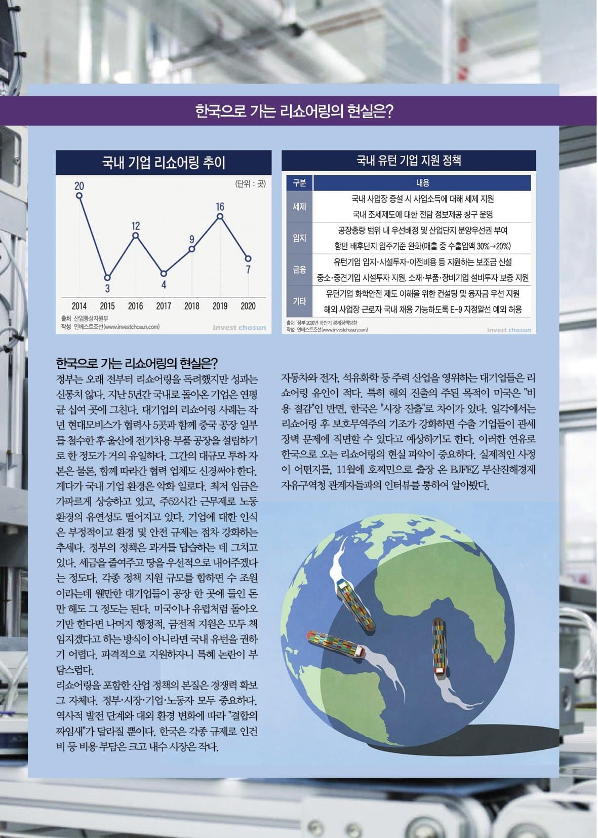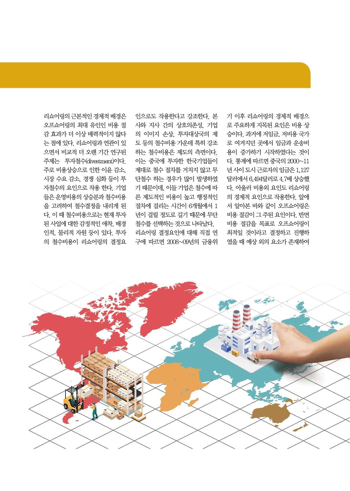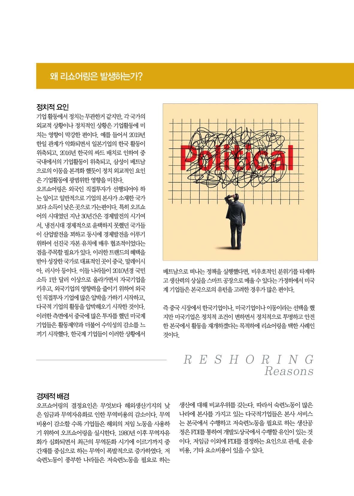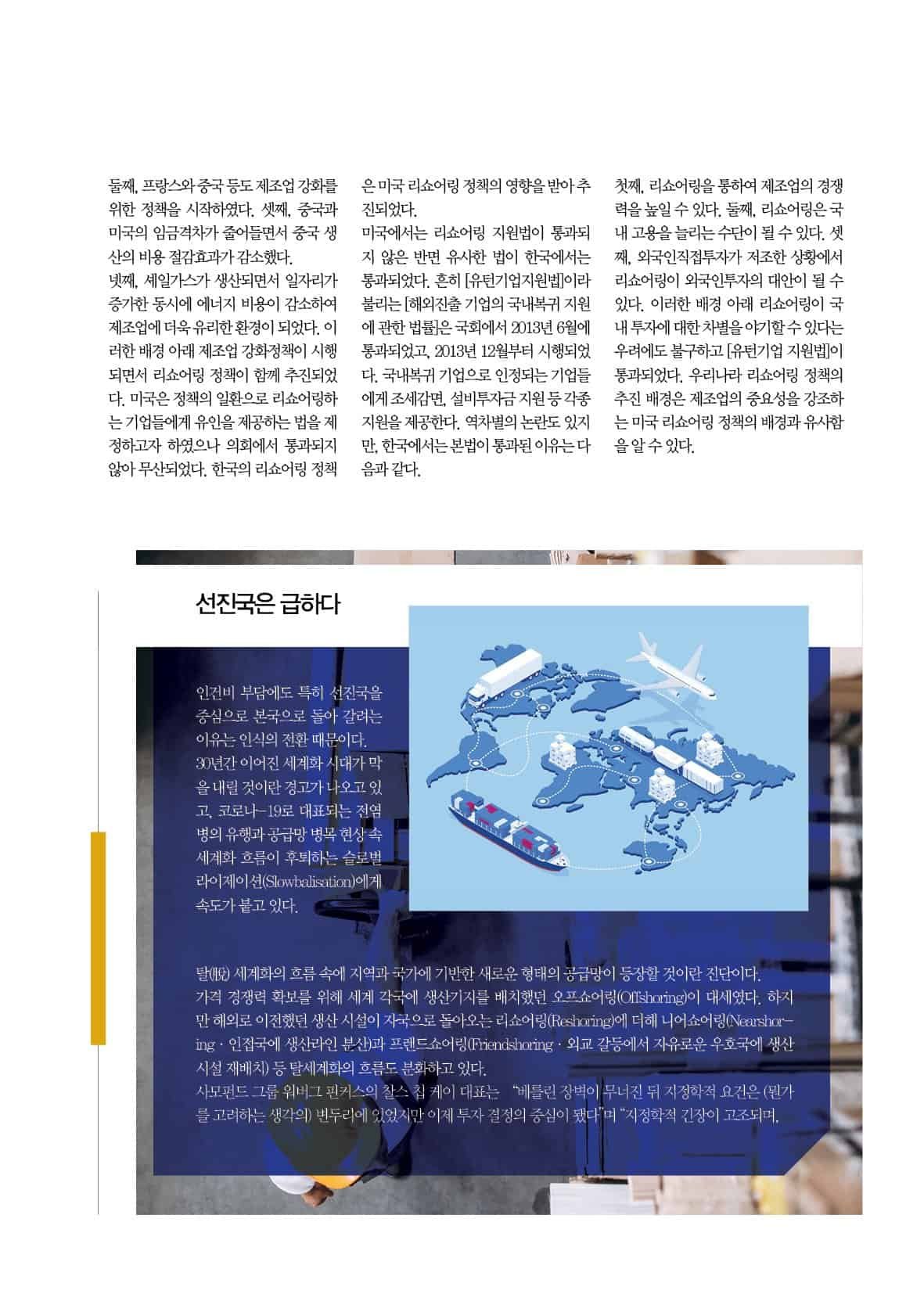 그리고 2020년 코로나-19 유행과 그후의 물류난으로 인하여 해외에 의존하는 경제를 지닌 한국에서도 리쇼어링에 대한 관심이 높아지고 있다. 과연 리쇼어링은 무엇인가? 어떠한 요인이 리쇼어링을 만들고, 한국으로 가는 리쇼어링의 현황은 어떠한가를 이번 스페셜리포트에서 알아봤다.