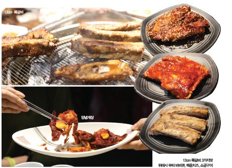 고기의 맛을 느낄 수 있는 13cm쪽갈비는 소금구이, 매운 치즈, 바베큐 맛 중에 선택 할 수 있다.