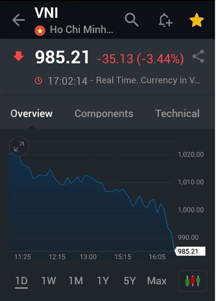 이날 VN지수는 장초반 잠깐 소폭 상승하기도 했으나 곧바로 하락세로 반전하며 시간이 갈수록 낙폭을 키웠으며, 특히 장마감 20분전부터 수직낙하하는 모습을 보였다.
