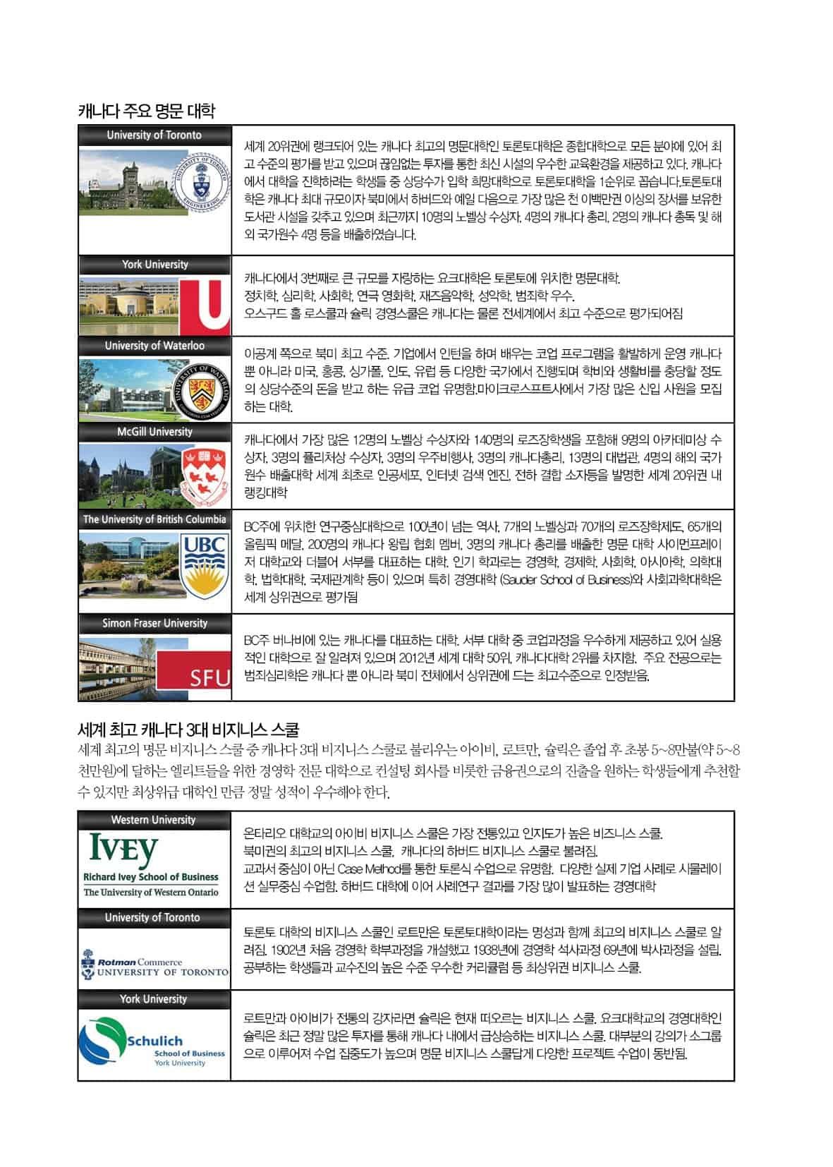 또한 캐나다 명문 대학들은 각종 연구성과 및 기술개발에 상당한 투자를 하고 있으며 우수한 교수진과 환경을 제공하고 있다.