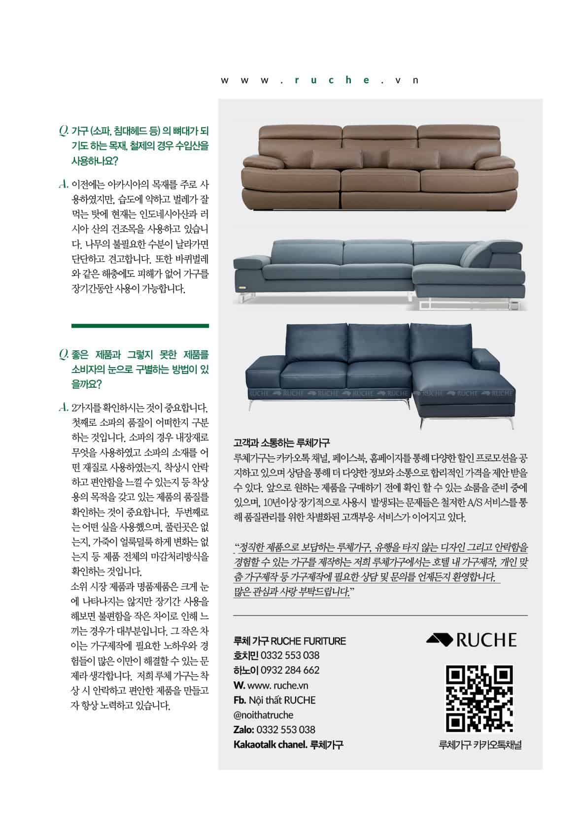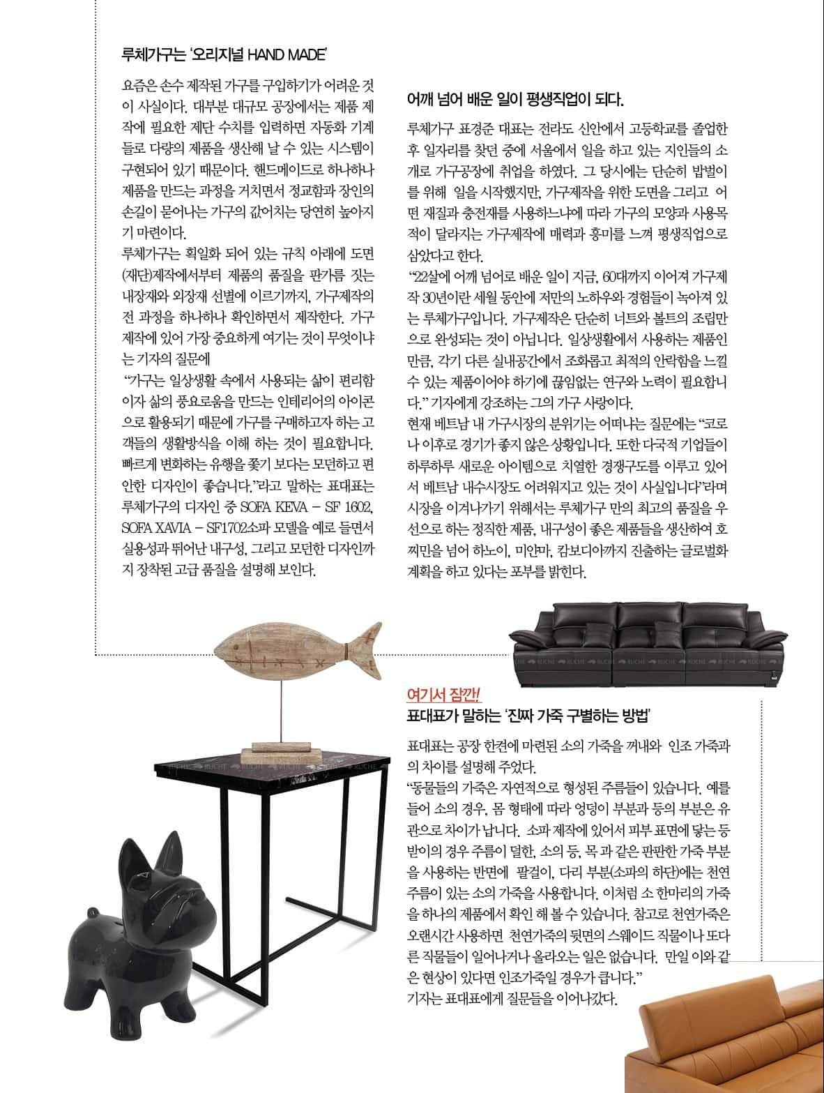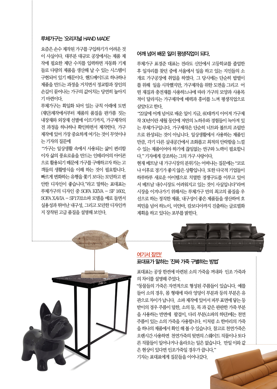 나에게 맞는 가구, 내가 원하는 소파를 만들고 있는 루체 가구를 찾았다. 고객의 니즈에 부응하고 정직한 제품들로 소비자의 인정을 받고 있는 ‘루체 가구’는 호찌민과 하노이지역을 넘어 미얀마까지 진출한 한국가구, 소파 제작 전문 브랜드이다. 한국교민분들과 현지인들의 꾸준한 사랑을 받으며 시간이 지날수록 그 가치가 더 해지는 루체가구 표경준 대표를 만나 가구의 꽃, 소파 이야기를 들어 보았다.