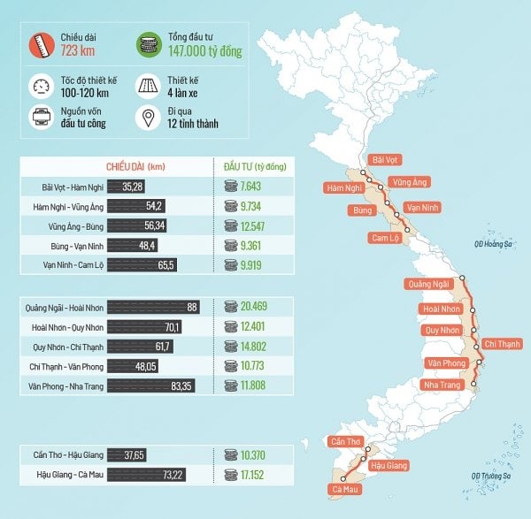 12개 구간은 총연장 729km로 총사업비 146조9900억동(62억2310만달러)이 투입돼 오는 2025년 완공, 2026년 개통 예정이다. 12개 구간은 크게 ▲북중부 하띤-꽝찌(Ha Tinh-Quang Tri) 267km ▲중부 꽝응아이-냐짱(Quang Ngai-Nha Trang) 353km ▲남부 껀터-까마우(Can Tho-Ca Mau) 109km 등으로 나뉜다.