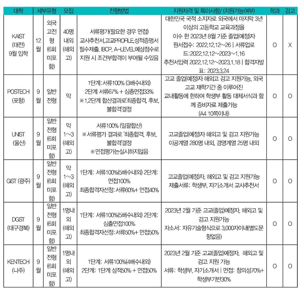 특정 소수 전공과 학교를 제외한 모든 한국대학은 수시전형에서 해외고 학생을 선발한다. 흔히 알고 있는 글로벌 특기자 전형뿐 아니라 일반 학생부 종합전형에서도 대부분 해외고 학생들을 뽑는다. 오히려 학생비율로 고려 해 볼 때 국내고 출신들 보다 해외고 학생들에게 숫자적 기회의 비율은 더 크다. 한국대학을 졸업해서 취업난에 부딪히는 것이 아니며, 해외대학을 졸업해서 해당국가에 취업하는 것이 국내 취업 못지않게 더 어려운 것 또한 자명한 사실이기 때문에 굳이 한국대학을 취업 때문에 기피할 문제는 아니다.