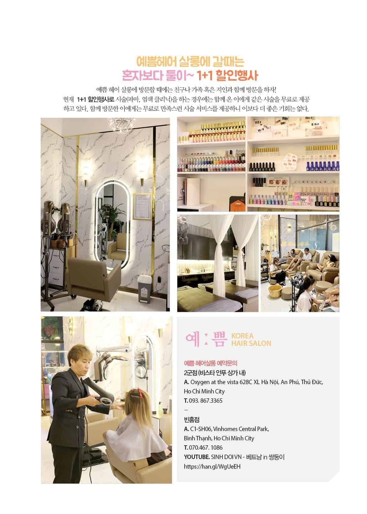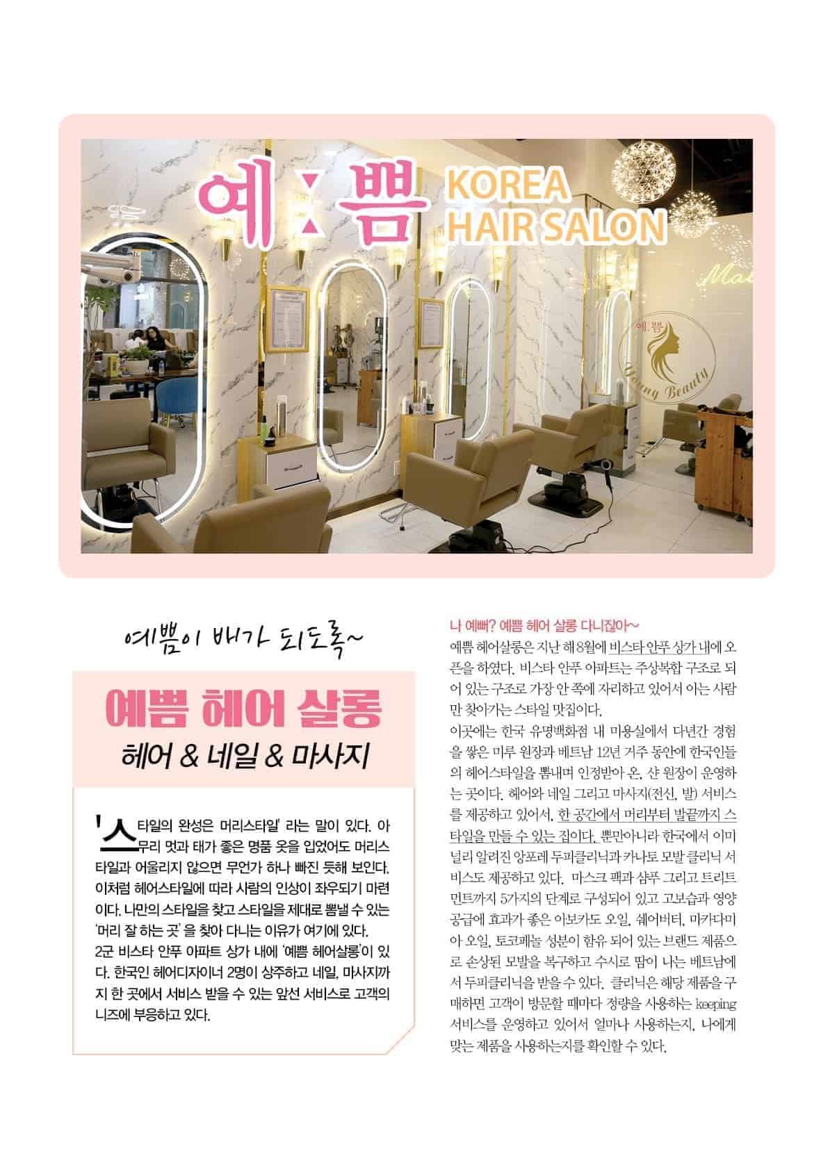 2군 비스타 안푸 아파트 상가 내에 ‘예쁨 헤어살롱’이 있다. 한국인 헤어디자이너 2명이 상주하고 네일, 마사지까지 한 곳에서 서비스 받을 수 있는 앞선 서비스로 고객의 니즈에 부응하고 있다.