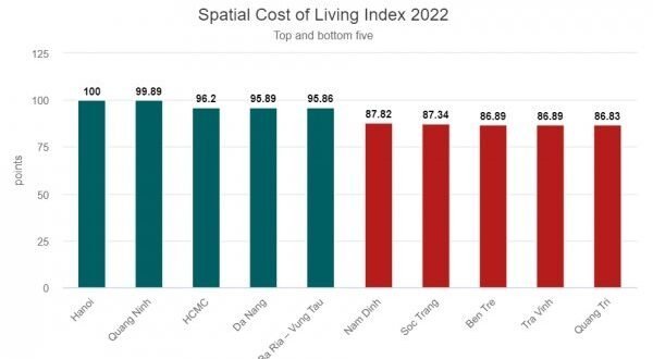 통계총국(GSO)이 최근 발표한 ‘2022년 공간생활비지수(Spatial Cost of Living Index)’에 따르면, 하노이시를 100점으로 놓았을 때 꽝닌성(99.89), 호찌민시(96.20), 다낭시(95.89), 바리아붕따우성(95.86) 순으로 생활물가가 비쌌다.