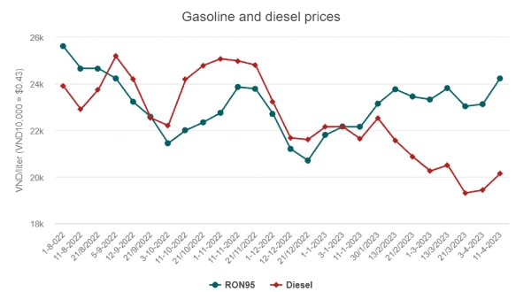 바이오연료가 포함된 휘발유 E5 RON92는 4.94% 오른 2만3170동(0.99달러), 경유는 2만140동(0.86달러)으로 3.65% 상승했다.