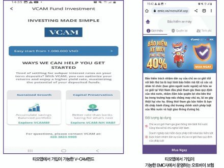 은행을 직접가지 않고도, 티모 온라인 앱을 활용하여 VCAM뮤츄얼 펀드에도 투자가 가능하며, 앱을 통하여, 여행보험, 그리고 MB은행의 자회사인 EMIC사에서 운영하는 오토바이 보험 가입이 가능하다. 아울러 계좌송금서비스, 해외계좌송금도 티모앱을 통하여 가능하다.