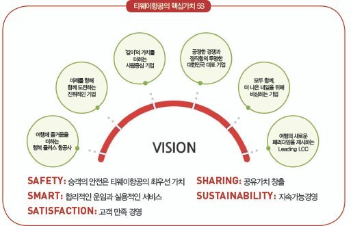 저희 티웨이항공은 정시성을 준수하며, 안전을 최우선 순위로 생각합니다. 그렇다고 고객서비스 만족을 후순위로 두지 않습니다. 저희는 매년 실시하는 한국 소비자원 또는 교통물류평가원의 고객만족도 조사에 저가 항공사 부문에서 거의 매년 1등을 하고 있습니다.