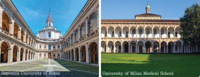 G7 일원이자 EU 회원국인 이탈리아는 2023년 기준으로 총 21개 의과대학 영어 과정이 개설되어 운영 중이며, 로마와 밀라노, 볼로냐, 토리노, 나폴리 등 유명 도시를 중심으로 메디컬 유학 프로그램이 형성되어 있다. 앞서 언급한 “중유럽” 국가와 가장 큰 차이는 바로 모든 영어 과정이 “이탈리아 자국민”을 기준으로 운영된다는 사실인데, 대학에 따라 7:3 ~ 4:6 정도의 비율로 “자국민 대 유학생” 정원이 고르게 분포한다. 따라서, 일부 의과대 유학프로그램이 “영리 목적으로” 운영되고 그로 인해 “부실한 교육과정 및 졸업 후 취업 가능성 취약” 등의 문제점을 나타내는 것과 달리, 1) 이탈리아 의대와 치대, 그리고 약대 등 각각의 영어 과정의 모든 졸업생은 “국적과 무관하게” 이탈리아 국내와 EU 회원국에서 차별 없이 취업할 수 있다. 실제로 최근 10년 동안 이탈리아 의치약대를 졸업한 “유학생”의 국적은 영국, 미국, 캐나다, 이스라엘, 그리스, 독일, 스페인, 프랑스, 한국, 일본 등으로 구성되어 있으며, 특히 한국인 1기 졸업생이 배출된 2020년을 기점으로 “파비아(Pavia)” 의과대학의 한국 보건복지부 인증이 이루어지며, 밀라노 스타탈레 의과대학과 로마 사피엔자 의과대학 등이 추가로 인증 대열에 합류할 예정인 것으로 나타났다.