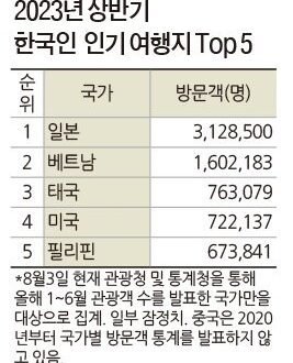한편 상반기 한국인 인기 여행지 순위는 8월3일 현재 관광청 및 통계청을 통해 올해 1~6월 관광객 수를 발표한 국가만을 대상으로 집계했다. 6월은 잠정치인 곳들이 있으므로 향후 확정치는 달라질 수 있다.