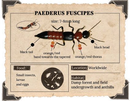 화상벌레는 청딱지개미반날개(Paederus fuscipes)라고 불리는 곤충으로, 화상과 비슷한 염증과 통증을 일으켜 화상벌레라고도 불립니다. 성충의 경우 대략 7~10mm 정도이고 특징적으로 검은색과 주황색 밴드가 교차해서 자리잡고 있습니다. 베트남 전역에 분포하며 낮에는 논과 같은 습지에서 해충을 잡아먹는 익충으로 알려져 있습니다.