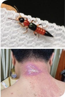 화상벌레는 물거나 쏘지 않고, 접촉 후 곤충에서 분비된 체액성분인 페더린(pederin)에 의해 페더러스 피부염을 일으킵니다. 병변이 선상 배열을 보이기도 하여 선상피부염이라고도 불립니다. 주로 안면, 목, 상지, 하지 등 노출 부위에 발생하며, 손을 통해서 다른 부위에 전파되기도 합니다. 눈 주위에 접촉되었을 때는 각막염, 결막염 등의 안증상이 유발되며 심한 경우에는 일시적인 시력 장애를 초래할 수도 있습니다.