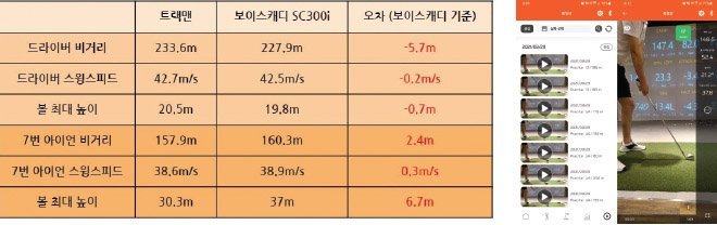 그렇다면 제일 중요한 데이터 정확도는 어떨까? 프로 선수들이 많이 쓰는 트랙맨 데이터와 비교해본 결과, 드라이버 샷의 경우 트랙맨에서 측정된 비거리는 233.6m, 보이스캐디에서 측정된 비거리는 227.9m였고, 스윙스피드와 볼스피드 오차 범위는 0.2m/s 이내로 매우 적었다. 단 볼 최대높이는 0.7m로 약간의 차이를 보였다.