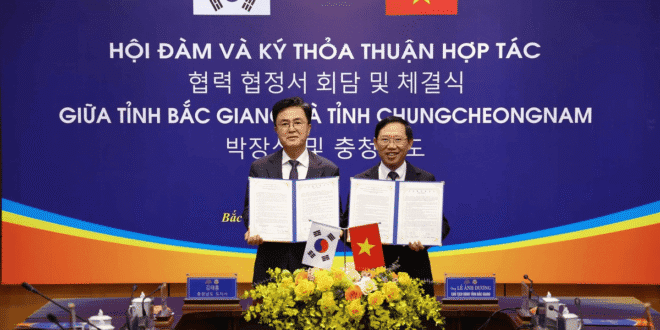 이날 충남도에 따르면 우리나라와 베트남의 포괄적 전략 동반자 구축 1년을 맞아 베트남을 방문 중인 김태흠 충남지사는 지난 5일(현지시간) 박장성 청사에서 레 아인 즈엉 박장성 인민위원회 위원장(성장)과 우호 협력 협정을 체결했다.