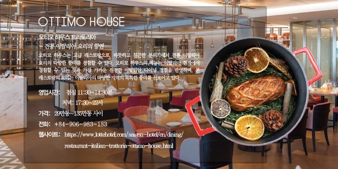 고급 레스토랑인 오티모 하우스(OTTIMO HOUSE)는 트라토리아(Trattoria)라는 명에서 유추하실 수 있듯이 따뜻하고 친근한 분위기에서 전통 이탈리아 요리의 다양한 풍미를 경험할 수 있으며, 호찌민시 최고의 가성비 좋은 서양식 요리를 제공합니다. 오티모 하우스의 메뉴는 이탈리아 현지에서 경험할 수 있는 것과 가장 가까운 진정한 이탈리안 다이닝 경험을 반영하며, 각 요리는 이탈리아의 다양한 지역의 독특한 풍미를 선보이고 있습니다. 오티모 하우스는 식재료가 주인공이 되는 이탈리아 요리의 전통이 지닌 심플함에 기반한 메뉴를 제공하고 있습니다. 클래식한 파스타 요리부터 지역 특선 요리까지, 오티모 하우스는 절묘한 미식의 향연을 즐길 수 있습니다.