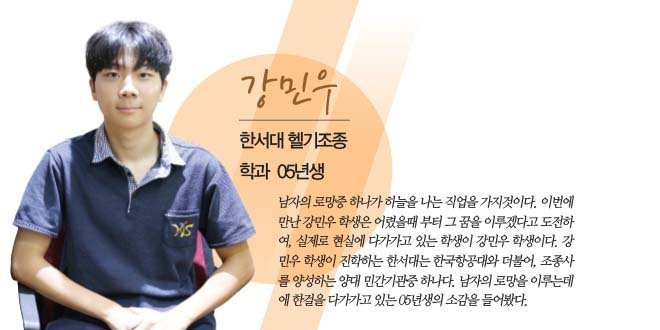 제가 어렸을 때부터 군인이 꿈이기도 했고 뭔가 좀 특수한 학과를 가고 싶다는 게 있어서 부모님이랑 같이 많은 학과를 찾아보다가 항공학과를 찾게 돼서 군인과 한서대가 연결이 되어서 졸업후 바로 헬기조정 준위로 임관할 수 있는 헬기조종학과를 고르게 됐습니다.