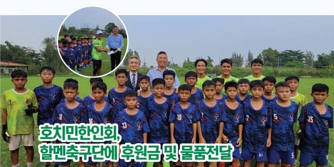 2023년12월27일 오후4시 베트남한인회총연합회 겸 호치민한인회 손인선 회장은 홍승표 상근부회장과 함께 연말을 맞이하여 탄롱스포츠센터에서 훈련하고 있는 제3기 할멘FC(한영국 감독)를 방문하여 후원금과 빵과 케이크 라면40박스 등을 전달하며 격려하였다. 제3기 할멘FC를 지도하고 있는 한영국 감독은 베트남의 소수민족 중에서 축구선수로의 대한 꿈과 희망을 가진 어린이들을 선발하여 합숙을 시키며 학교도 보내고 방과 후에 축구를 가르치고 있다. 지난 2021년에 제2기 할멘FC 선수들이 베트남축구협회가 주관했던 17세 전국 클럽대항전에서 전국4강에 들며 매스컴의주목을 받았다. 한영국 감독은 이번 3기 할멘FC선수들의 기량이 뛰어나 더 좋은 성적에 대한 기대를 걸고 있다며 한참 성장할 선수들에게 충분한 지원을 못 해주는 것이 안타깝다며 아이들에게 따뜻한 손길과 후원을 희망했다. 후원문의 : 한영국감독 090-878-1703