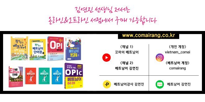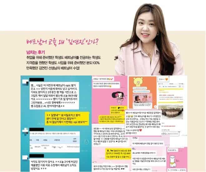 “현재 김연진 강사는 꼬마이랑에서 베트남어 첫 시작 입문반, 회화반, 자격증 (OPIc, OPI, ABC능력시험, topiV) 등 다양한 수업을 진행하고 있다.” 저서로는 착붙는 베트남어 시리즈, 한 번에 끝 베트남어 OPI, 한권으로 마침표찍는 OPIc 베트남어, 나의 하루 1줄 베트남어 쓰기수첩 등 총 9권정도의 교재를 발간했다.