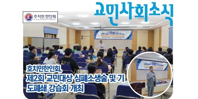 호치민한인회는 2024년 1월31일 오후2시부터 4시까지 주호치민총 영사관 별관(호치민한인회 2층 강당)에서 제2회 호치민 교민들을 위한 심폐소생술/기도폐쇄 강의 및 실습의 시간을 가졌다. 호치민한인회가 주최 및 후원을 하고 산업안전보건원(원장 이재성)에서 이론 강의 및 실습을 맡아서 진행하였고 50여명의 교민들이 함께하였다. 2시간여 동안 이루어진 교육과정 및 실습과정에 교민들은 적극적으로 동참하여 교육에 임하였으며 특히 학생들의 참여가 많았다. 호치민한인회 손인선 회장은 인사말을 통해 “누구에게나 일어날 수 있는 만일의 경우를 대비하여 골든타임을 놓치지 않고 내 가족, 내 이웃의 소중한 생명을 살릴 수 있는 오늘의 이 교육에 많은 교민들이 참여해 주심에 감사드리고 소중한 시간이 되길 바랍니다.” 라고 하였고 호치민한인회에서는 향후에도 지속적으로 본 교육 및 실습과정을 이어 갈 예정이라고 하였다. 한편 오늘의 교육과정은 무료교육이 아닌 정식 수료증이 발급되는 유료과정이었다.