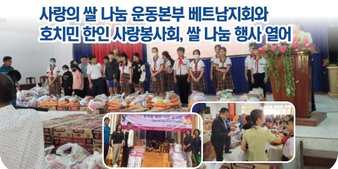 “사랑의 쌀 나눔 운동본부 베트남지회(회장 이충근)”와 “호치민 사랑봉사회(회장 신종원)”의 주최로 2024년1월31일 (수) 빈푹성 민흥 인민위원회에서 “2024년 제8회 설 맞이 사랑의 쌀 나눔” 행사를 가졌다. 금번 행사의 후원단체로는 재 베트남 대한체육회 호치민 지회 회장 민경창, 베트남 재난상조 위원회 위원장 강성문, 김영선 고문, 민흥 한국공단 부회장 신병훈이 공동주관 하고 C&N VINA 회장 이충근, DAEAH E&C 사장 박희영, SH C&E 대표 민경창, SSG Co 대표 김동학, LATH GROUP 대표 한재상, MAIN Co 대표 최충천 및 민흥한국공단 입주업체가 참여하였다. 빈푹성 민흥지역의 451가구를 대상으로 한 사랑의 쌀 나눔 행사 후 “호치민 사랑봉사회” 와 민흥 한국 공단과 공단 입주 후원업체 일동은 고아원을 방문하여 후원물품을 전달하고 봉사활동을 가졌다. 호치민 사랑봉사회는 호치민 여성자원봉사단으로 시작하여 8년 전 호치민 사랑봉사회로 새로 출범한 후 사랑의 쌀 운동본부 베트남 지회와 교민단체들과 제휴하여 베트남의 불우한 이웃과 소년소녀 가장, 고아원을 돕기 시작하여 금년으로 8회 차를 맞이하게 되었다. “호치민 사랑봉사회” 신종원 회장은 앞으로도 지속적으로 베트남의 많은 교민단체와 봉사단체들과 협력하여, 베트남의 불우한 가정과 이웃을 돕는 기회를 보다 더 많이 갖도록 노력 하겠다고 밝혔다.