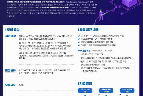 CTS 프로그램 Seed 1 공모 지원을 계획하고 있거나 글로벌 비즈니스 기본역량을 보유한 팀이라면 지원가능하며, 모집분야는 과학기술혁신, 도시, 물, 에너지, 기후행동, 교통, 농촌개발, 교육, 보건, 거버넌스, 성평등, 인권 등 12개 분야이다.