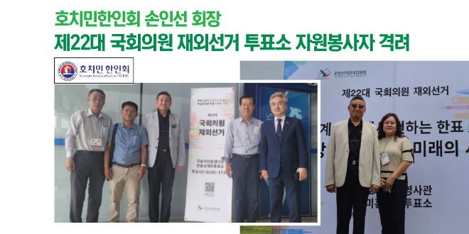 호치민한인회 손인선 회장과 홍승표 상근부회장은 2024년3월30일~2024년3월31일 주말임에도 불구하고 양일에 걸쳐 빈증코참, 호치민시한국국제학교 등 제22대 국회의원 재외선거 투표소에 방문하여 담당 영사와 자원봉사자들에게 음료수 및 커피를 제공해주며 격려하였다.