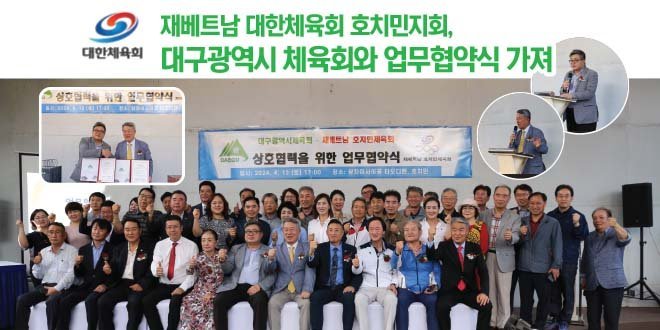 재베트남 대한체육회호치민지회는 대구광역시체육회와 상호교류 및 발전을 위한 업무 협약을 체결했다. 지난 4월 13일 호치민 2군 샹차이에서 열린 협약식에는 재베트남 대한체육회 호치민지회 민경창 회장 및 호치민지회 임원단과 대구광역시체육회 박영기 회장을 비롯한대구광역시체육회 관계자등 60여명이 참석한 가운데 진행됐다. 이번 협약은 양 기관이 보유하고 있는 역량과 자원을 적극 활용하고 국제스포츠교류 활성화 등을 위한 상호협력을 하기로 했다. 협약 사항으로는 생활체육 동호인 교류 기타 양기관 상호 협의를 통해 합의된 사업 추진에 대한 협력 등에 관한 사항등이 있다.