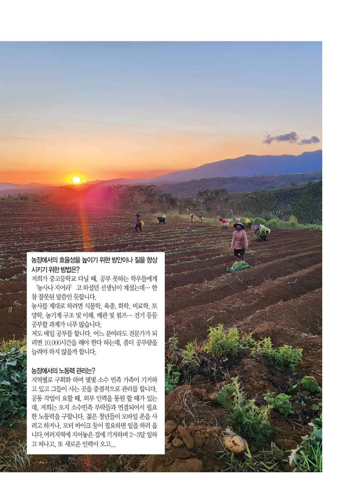 그리고 이곳은 1,200m 고지에 늘 서늘한 기후로 섭씨 영상 9도~ 26도를 유지하며, 고온 건기 4월에만 약 18~32도를 유지하여 고랭지 채소 재배 적지로 평가되고 있습니다. 몇 년 전 평창 고랭지 채소 연구소의 박사님들 일행이 오셔서 배추, 무 등의 재배에 적합하며 평창과 비슷한 환경이라고 추천해 주셨습니다.