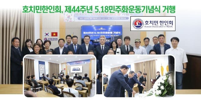 호치민한인회는 2024년 5월18일 오전11시 호치민한인회 회의실에서 제44주년 5.18민주화운동기념식을 거행하였다. 호치민한인회 전경주 부회장의 사회로 진행된 이날 기념식은 개식선언, 국민의례, 5.18민주화운동 주제영상 및 경과보고(영상시청)등 으로 이어졌다.