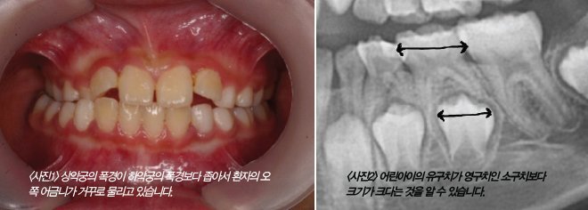 아닙니다. 턱 크기가 이상이 없더라도 치과에 오셔서 교정 체크를 받으셔야 합니다. 턱의 크기는 전후방적으로 뿐만 아니라 폭경에도 부조화가 있을 수 있기 때문에 꼭 의사에게 체크를 받아보시는게 좋습니다<사진1>. 또한 공간이 부족한 경우에는 ‘공간유지장치’를 사용하여 추후 작은 어금니의 발치 없이 교정이 가능할 수 있습니다. 작은 어금니 부위는 유치가 영구치보다 크기가 크기 때문에 치아를 교체하는 과정에서 공간에 여유가 있습니다<사진2>. ‘공간유지장치’는 이 여유공간을 활용하는 것으로 유치를 가지고 있는 시기에만 사용할 수 있기 때문에 턱 크기에는 크게 이상이 없어 보이더라도 부모님은 아이를 데리고 치과에 오셔서 미리 진료를 받아보셔야 합니다.