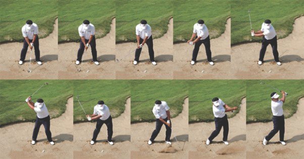 백스윙 때 코킹 타이밍을 빠르게 가져가 업라이트한 궤도를 만들고, 가파르게 클럽을 끌어내리며 볼 뒤 모래를 타격한다. 그리고 손목의 회전, 즉 릴리스를 빠르게 해주며 헤드를 타깃보다 안쪽으로 잡아당기듯 들어올린다. 헤드의 궤도가 ‘V’이며 아웃-인이다.