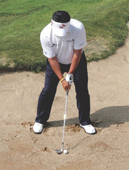 벙커샷은 아마추어 골퍼의 실수 유형 중 하나인 ‘뒤땅’이 필수다. 볼 뒤 2~5센티미터 지점을 타격해야 한다. 골프스윙에서 치명적인 실수지만 벙커에서는 볼을 탈출시키는 해법이라는 점을 명심하자. 그렇다면 뒤땅은 왜 발생하는 것일까. 백스윙 때 오른발로 이동한 체중은 다운스윙 때 왼발로 이동한다. 이때 체중이 오른발에 남아있다면 헤드가 볼 뒤를 치게 된다. 따라서 벙커샷에서는 체중을 오른발에 둔 상태로 스윙할 필요가 있다. 최경주의 스윙을 보면 임팩트 후에도 체중이 오른발에 집중됐다는 것을 알 수 있다.