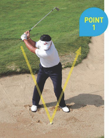 백스윙 때 코킹 타이밍을 빠르게 가져가 업라이트한 궤도를 만들고, 가파르게 클럽을 끌어내리며 볼 뒤 모래를 타격한다. 그리고 손목의 회전, 즉 릴리스를 빠르게 해주며 헤드를 타깃보다 안쪽으로 잡아당기듯 들어올린다. 헤드의 궤도가 ‘V’이며 아웃-인이다.