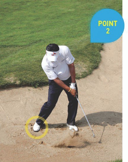 벙커샷은 아마추어 골퍼의 실수 유형 중 하나인 ‘뒤땅’이 필수다. 볼 뒤 2~5센티미터 지점을 타격해야 한다. 골프스윙에서 치명적인 실수지만 벙커에서는 볼을 탈출시키는 해법이라는 점을 명심하자. 그렇다면 뒤땅은 왜 발생하는 것일까. 백스윙 때 오른발로 이동한 체중은 다운스윙 때 왼발로 이동한다. 이때 체중이 오른발에 남아있다면 헤드가 볼 뒤를 치게 된다. 따라서 벙커샷에서는 체중을 오른발에 둔 상태로 스윙할 필요가 있다. 최경주의 스윙을 보면 임팩트 후에도 체중이 오른발에 집중됐다는 것을 알 수 있다.