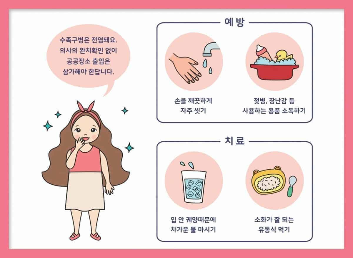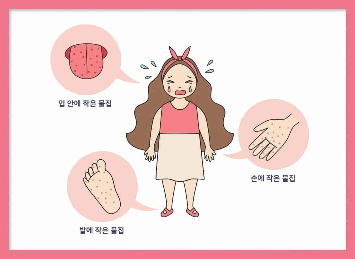 • 증상: 발열, 피로, 인후통, 구강 점막 및 피부 병변, 주로 손바닥, 발바닥, 무릎, 엉덩이에 물집 형태로 나타납니다.