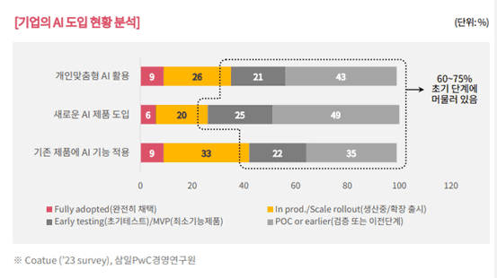 Coatue지가 2023년 조사에 따르면. 조사대상 기업의60% 이상이 생성형AI를 도입할 의향을 보였지만, 오직9%만이AI를 완전히 채택했으며, 약60~75%의 기업은 아직 파일럿 테스트 또는 초기 검증단계 인 것으로 나타났다.