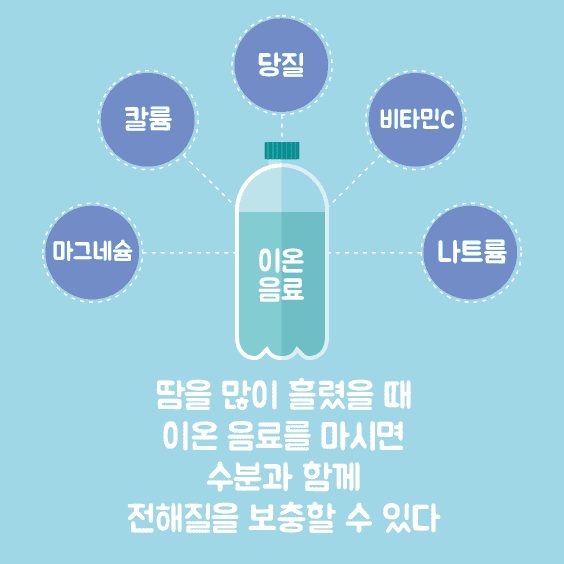 여기서 우리가 주의있게 살펴야 할 점은 바로 뜨거운 여름날 야외에서 과다한 운동으로 인해 많은 땀을 흘릴 경우 일어나는 현상이다. 이렇게 운동 중 땀으로 배출되는 필수 전해질 성분(나트륨, 칼륨, 칼슘, 마그네슘 등)과 수분, 에너지원 등을 체내에 빠르게 보충하기 위해 만들어진 음료를 이온음료라고 부르는데 외국에서 주로 스포츠 음료(sports drink) 또는 전해질 음료(electrolyte drink)라고 불린다.