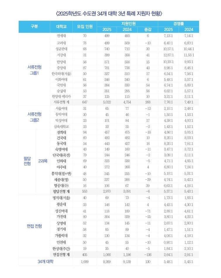 전형별로 보다 세부적으로 설명하면 서류전형 11개 대학(3개 여대 등 제외) 지원자는 전년도 4,754명 보다 268명이 늘어난 5,022명으로 7.76:1의 경쟁률을 나타냈다. 필답전형은 전년도 3,091명에서 6명 줄어든 2,970명이 지원하여 5.37:1의 경쟁률을 보여 지원자 변화는 비교적 적었다. 반면 면접전형에서는 작년도 보다 136명이 줄어든 1,066명이 지원하여 2.64:1의 경쟁률을 보였다. 결론적으로 서류전형 대학은 지원자가 늘어난 반면 면접전형 지원자는 줄어들었다. 필답전형 지원자는 대학별 편차는 있으나 전체적으로는 소폭 감소하였다.