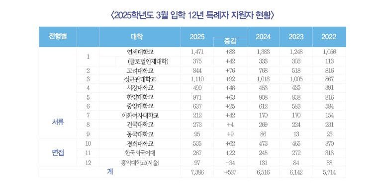 또다른 현상 중 하나는 면접 전형을 기피한다는 것이다. 아직 그 현상이 뚜렷한 지표로 나타나지는 않지만 입시지도 현장에서는 학생들의 생각을 자주 접하게 되고 있다. 그것은 서류전형 대학이 늘어나면서 면접 전형 1-2개 대학을 준비하기 위해 국내에 입학하여 준비하기 보다는 차라리 중하위권 서류전형이나 특히 여학생들의 경우 서류 100%인 3곳의 여대(서울여대,동덕여대,덕성여대)에 지원하는 것이 차라리 효율적이라는 판단 인 듯하다. 올해 성신여대의 지언자가 크게 줄어든 것은 이런 입시구도에 따른 선택의 결과로 나타난 현상으로 보인다, 12년 특례자의 경우 지원자 크게 증가! 금년도 12년 특례자의 증가는 크게 두드러졌다. 지난 코로나 상황에서 국제학교 졸업생들의 국내 대학 선회 이후 최대 규모인 듯하다. 상위 12개 대학 지원자만을 대상으로 할 경우 작년도 6,516명에서 올해는 7,386명으로 537명 이상 증가하였다. 이는실질적인 인원은 100명 이상이 늘었다는 것이다. 이는 단순 지원자만을 볼 때 3년 특례자의 1.4배 정도에 이르는 숫자이다.