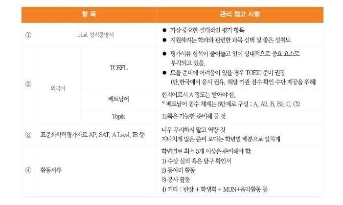 서류전형을 준비하기 위해서는 대학들의 <평가서류>에 대한 내용을 파악해야 한다. 그것은 고교 성적증명서와 외국어 인증서, 표준화학력자료 그리고 활동서류가 그것이다. 각 항목에 대한 준비를 아래 표를 보면서 참고해 보기 바란다.