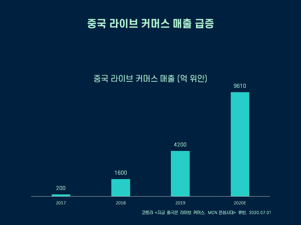 코트라에 따르면 중국의 라이브 커머스 매출액은 2017년 200위안으로 시작해, 2020년 9,610위안(한화로 160조원)으로 예상되고 있다. 특히 2017~2020년 약 사이 4,800% 성장할 정도로 급격한 시장의 확대가 이뤄졌다.