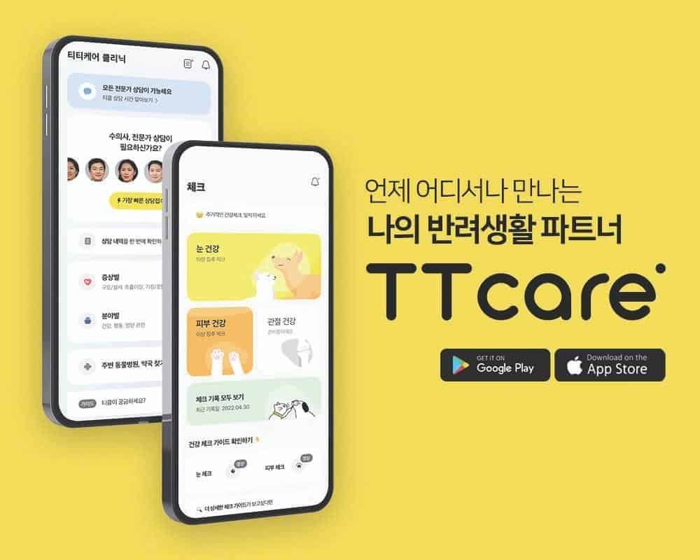 2021년 출시된 반려동물 건강관리 앱 티티케어는 편리함으로 빠르게 인기를 얻어, 누적 회원 수 약 30만 명, 누적 검진 수 약 60만 회를 기록하고 있다. 티티케어의 장점은 별도의 장비 없이 집에서도 반려동물의 건강검진이 가능하다는 점이다. 반려동물의 눈, 피부, 치아, 걸음걸이를 촬영하면 AI가 분석해 질환 유무를 알려준다. 또한 수의사, 훈련사와의 실시간 상담 기능으로 반려인들의 고민 해결에 도움을 준다.