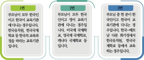 세 번째 유형은 부모 중 한 분이 한국인이고, 한국어 교육기관에 다니거나 다니길 희망하는 경우입니다. 한국인과 베트남인의 국제결혼으로 다문화가정을 이루었고 부모님은 주로 한국어로 대화를 합니다. 하지만 육아는 베트남어가 모국어인 어머니가 담당하는 경우가 많습니다. 외조부모가 함께하는 경우도 빈번합니다.