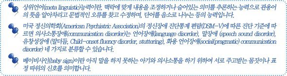 우리는 편의상 말이 늦는다고 하지만, 정확한 명칭은 의사소통이 늦는 것입니다. 정확한 명칭은 의사소통장애(communication disorder)2)입니다. 따라서 언어치료가 아니라 의사소통치료 입니다.