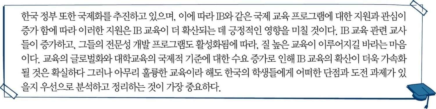 1968년 스위스 제네바의 한 국제학교에서 처음 도입된 IB (International Baccalaureate) 디플로마 과정은, 현재 전 세계의 국제학교 및 공교육 기관에서 “ 시대의 부름” 이라고 일컬어 지며 빠르게 확산되어 교육의 패러다임 변화의 물결을 타고 있다.
