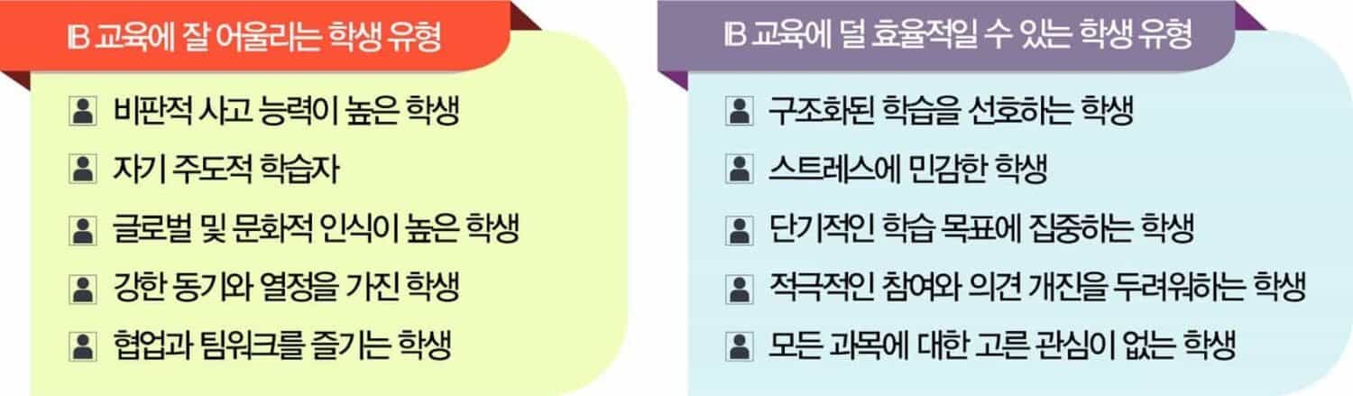 학부모들의 당면한 이해를 돕기 위해 IB에 실질적으로 어울리는 학생의 유형을 간단히 정리하여 IB교육의 소개를 마무리 한다.