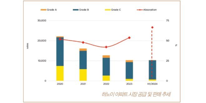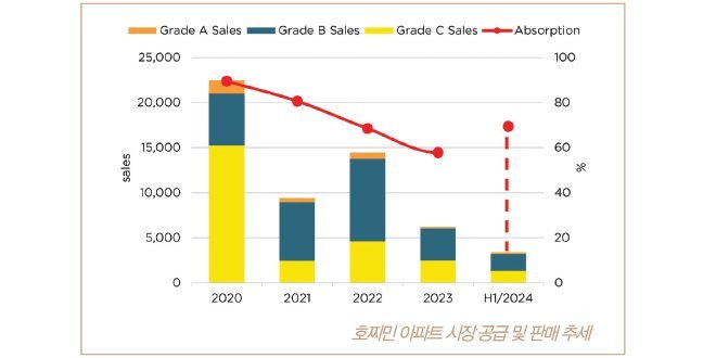 2020년부터 2024년 상반기까지 호찌민시 아파트 시장은 뚜렷한 변화 양상을 보이고 있다. 전체 판매량은 2020년 약 22,000채에서 2023년 약 6,000채로 급격히 감소했다. 특히 C등급 아파트 판매가 큰 폭으로 줄어들어 시장 구조 변화를 주도한 반면, B등급 아파트는 상대적으로 안정적인 판매량을 유지하며 시장의 중심축으로 부상했다. 주목할 만한 점은 흡수율 추이다. 2020년 90% 수준이던 흡수율은 2023년 60% 미만으로 하락했으나, 2024년 상반기에 70% 수준으로 반등했다. 이는 시장 회복의 긍정적 신호로 해석된다. 등급별로는 C등급 아파트의 비중이 크게 줄어든 반면, B등급의 비중이 늘어났다. A등급 아파트는 일정 수준을 유지해 프리미엄 시장의 안정성을 보여주고 있다. 2024년 호찌민시 아파트 시장은 2분기에 신규 공급이 증가했으나, 주로 외국인 수요가 적은 B, C등급 아파트에 집중됐다. 특히 투득시와 서부 지역에 공급이 몰렸다. 판매량은 2분기에 이미 작년의 절반 수준을 넘어서 2023년과 같은 수준을 달성했다. 이는 유리한 대출 금리와 개발업체들의 인센티브에 힘입어 시장 신뢰가 회복되고 있음을 시사한다. 전반적인 기본 가격은 안정세를 유지했지만, 30억 동 미만의 저렴한 주택 옵션은 여전히 부족하다. 이로 인해 향후 공급은 빈즈엉과 동나이 같은 위성 지역으로 이동할 것으로 전망된다. - 하노이 아파트 시장